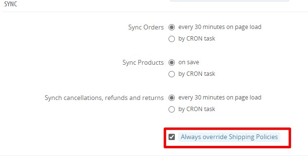 To allow the module to update the Shipping policies check the "Always override Shipping policies" box in the "Settings" tab of the module.