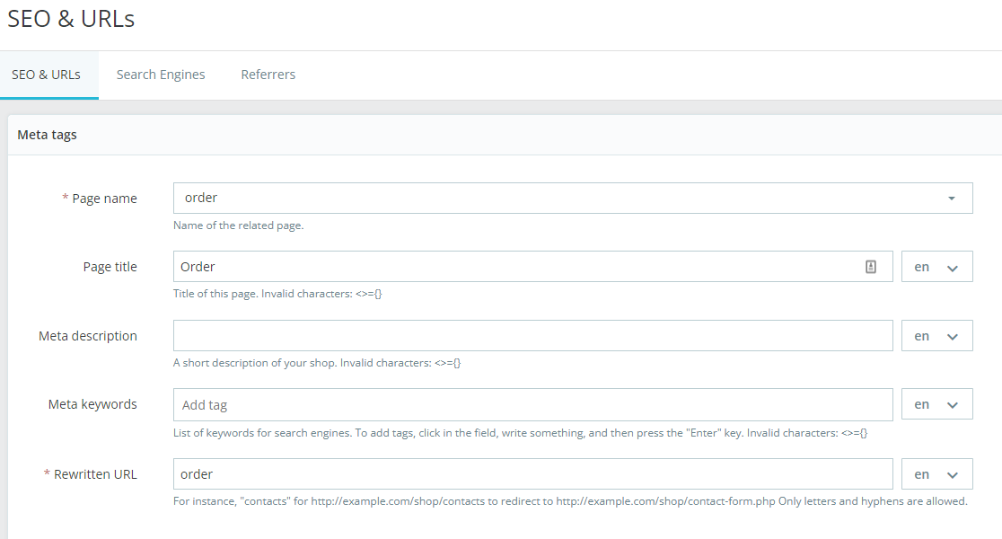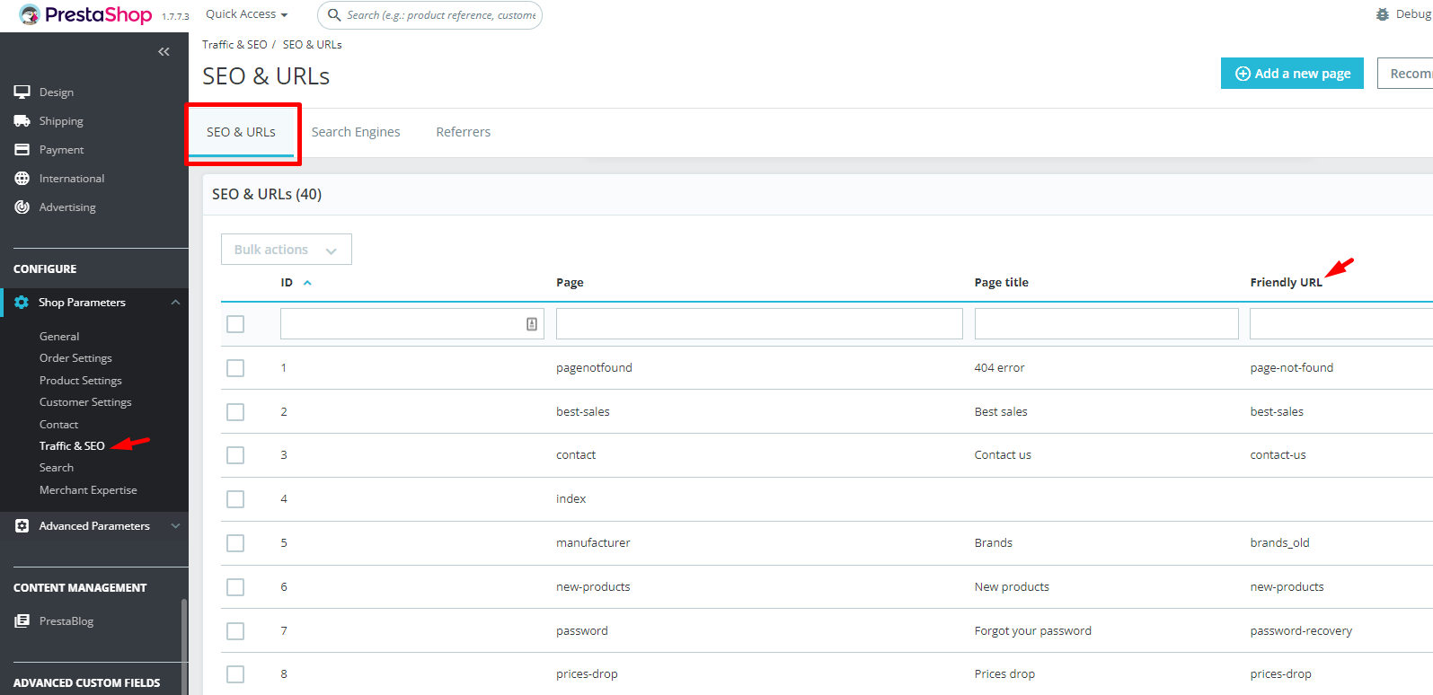 To proceed, in the PrestaShop menu click on "Shop parameters", then on "Traffic & SEO."