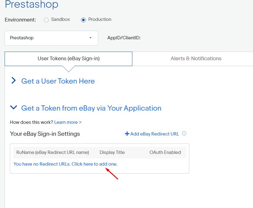 and in this case you would see the message “You have no Redirect URL. Click here to add one”. In this case, click on the link.