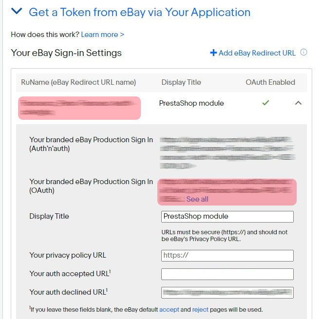 11) Paste “RuName” and “Your branded eBay Production Sign In (OAuth)” in the corresponding fields of the eBay module.