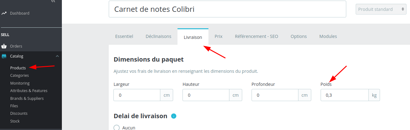 Il faut donc se rendre dans votre Back office > Catalogue > Produits, choisir le produit à l'origine de l'erreur et modifier son poids dans la fenêtre Livraison.